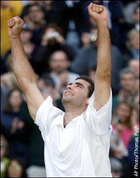 Pete Sampras raises arms after defeating Patrick Rafter. Sampras won the rain-interrupted final 6-7 (10-12), 7-6 (7-5), 6-4, 6-2.