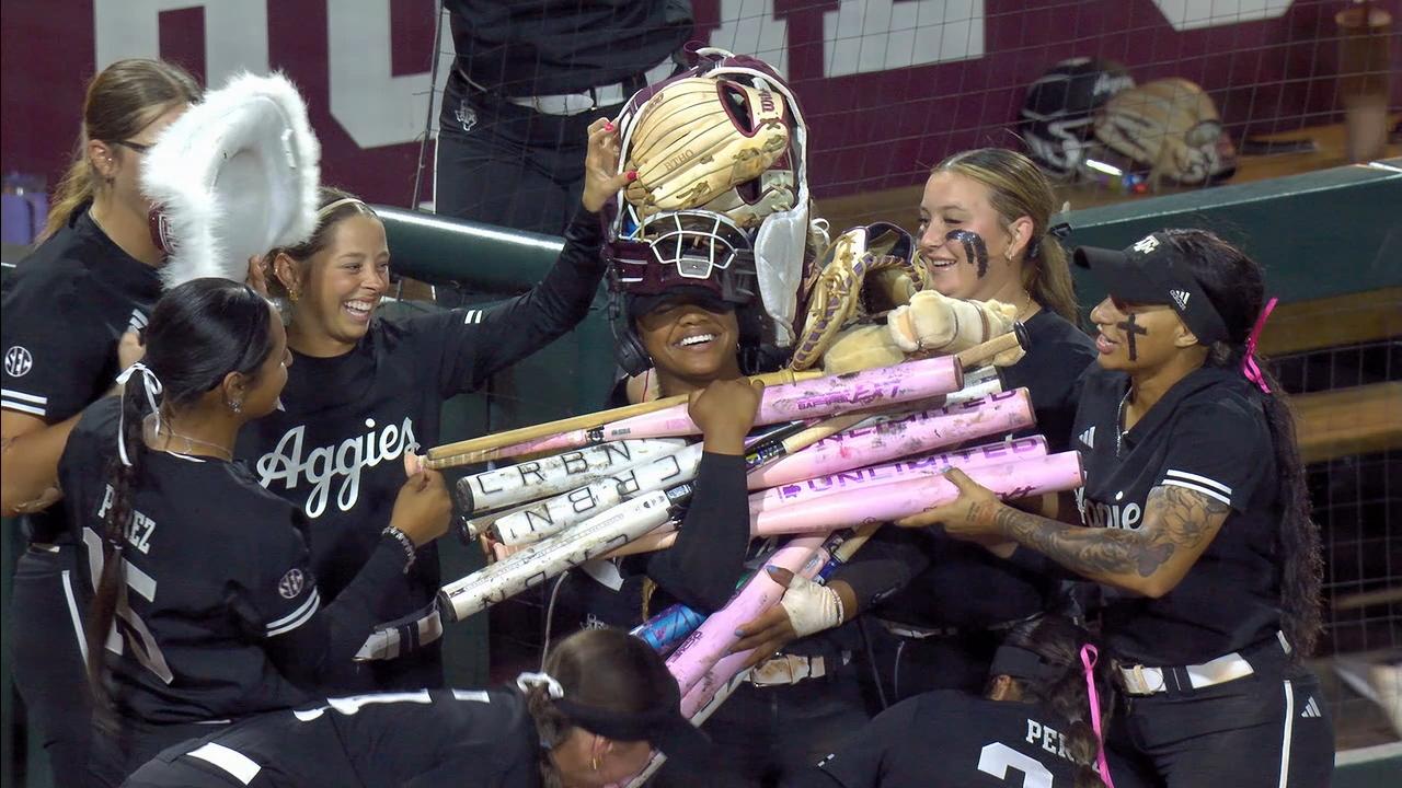 Powell shouts out the Aggies' faithful before being bombarded by her teammates after they pick up the series win in their doubleheader vs. Georgia.